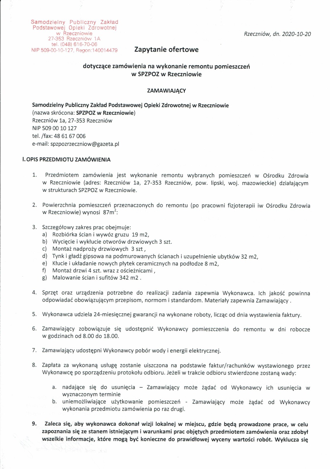 pomieszczeń w SPZPOZ w Rzeczniowie