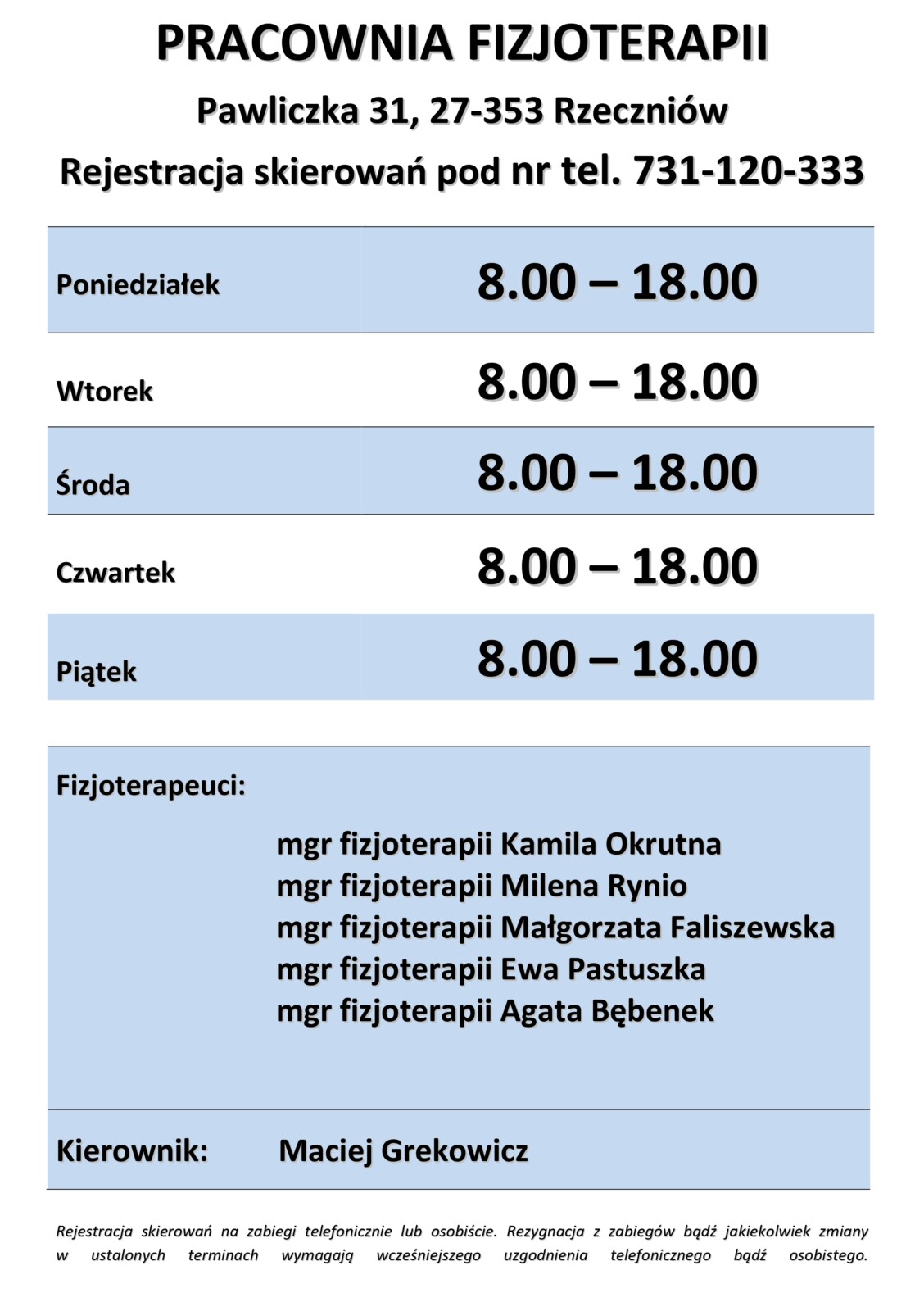 · Wpisywanie pacjenta na listy oczekujących następuje w dniu zgłoszenia się do rejestracji, od poniedziałku do piątku w godzinach 8.00-18.00 – godziny pracy Pracowni Fizjoterapii w Pawliczce,